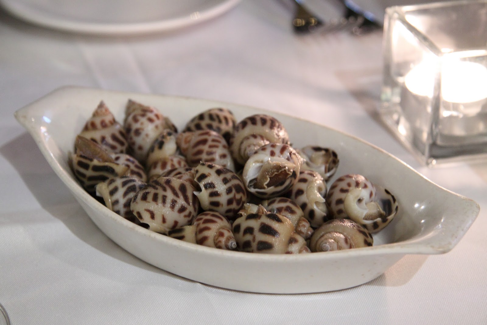 Appetizer 1: babylonia Nutty and slightly chewy, as they should be, and served with a slightly garlic-y dip with a texture in-between aïoli and vinaigrette. Very nice. |